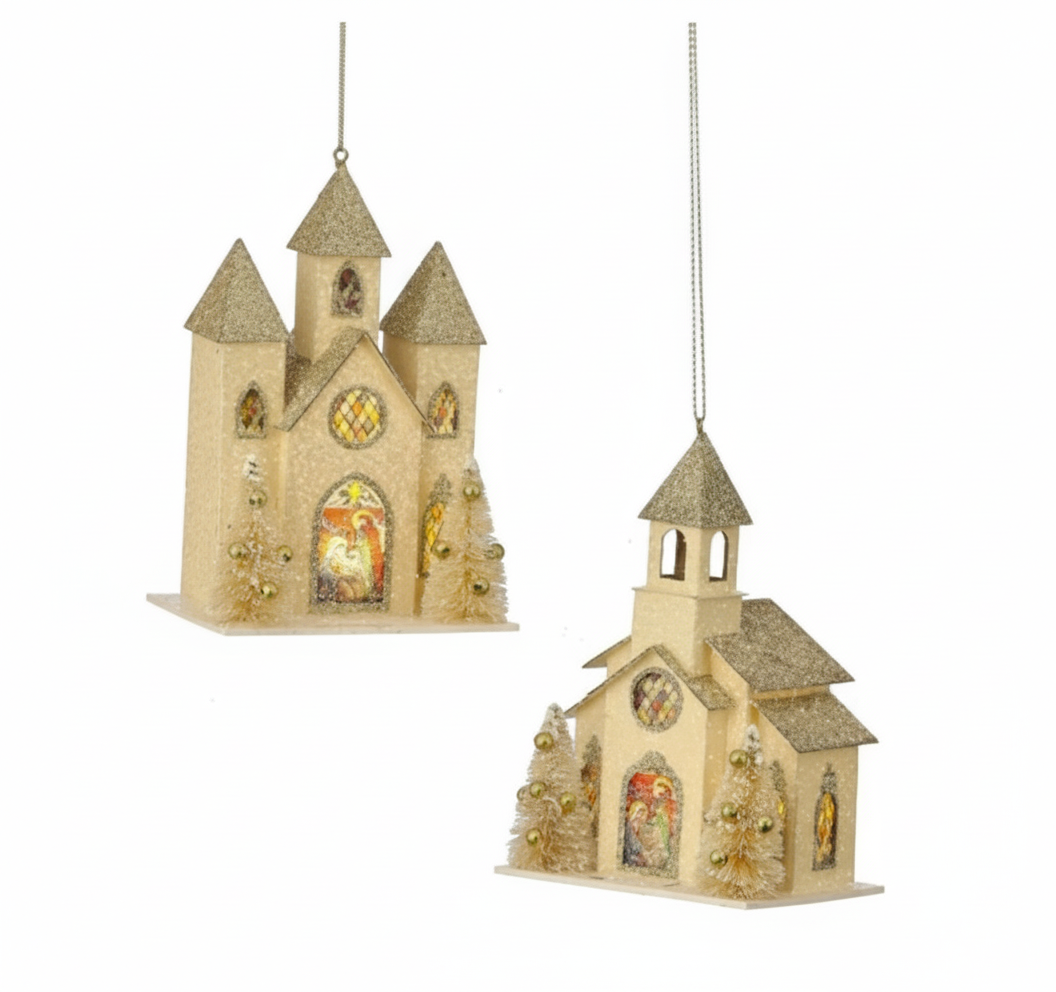 Estos encantadores adornos individuales de Iglesia Vintage capturan la esencia mágica de la temporada con un estilo clásico. Cada modelo, ya sea la imponente Catedral o la pintoresca Iglesia con Campanario, presenta un acabado granulado y brillante en tonos dorados y crema, transportándote a un cuento navideño.