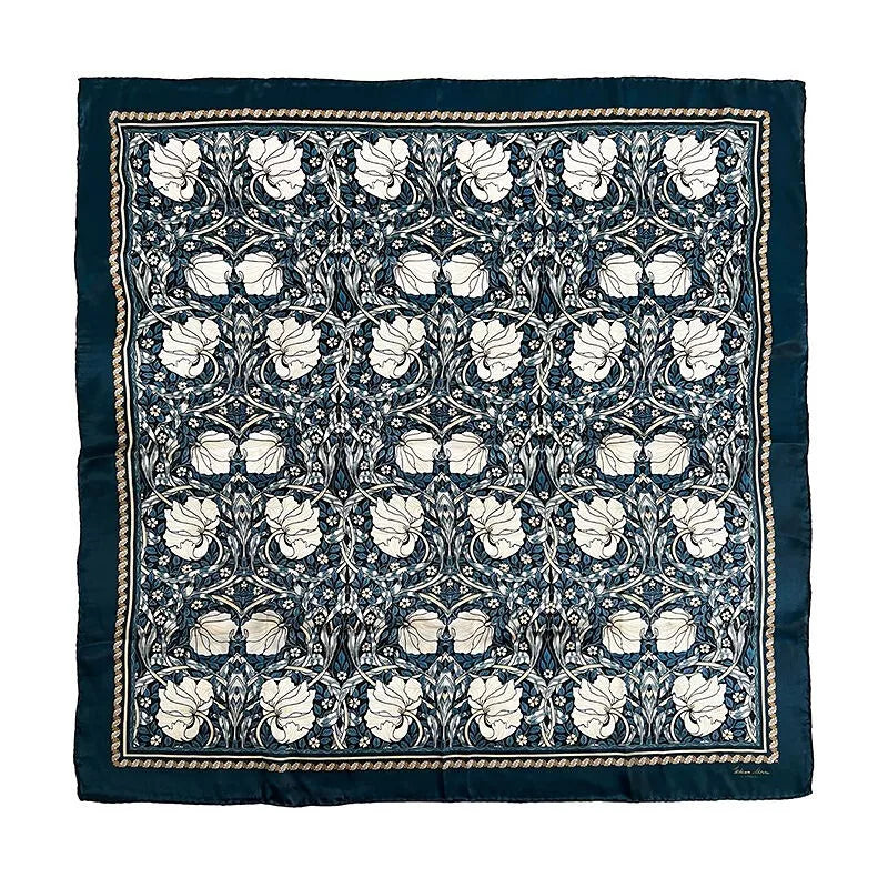 Añade un toque sofisticado y artístico a tu look con este lujoso pañuelo de seda inspirado en el icónico motivo Pimpernel Blue de William Morris. Su diseño botánico en tonos azules fríos ofrece una estética refinada que nunca pasa de moda.