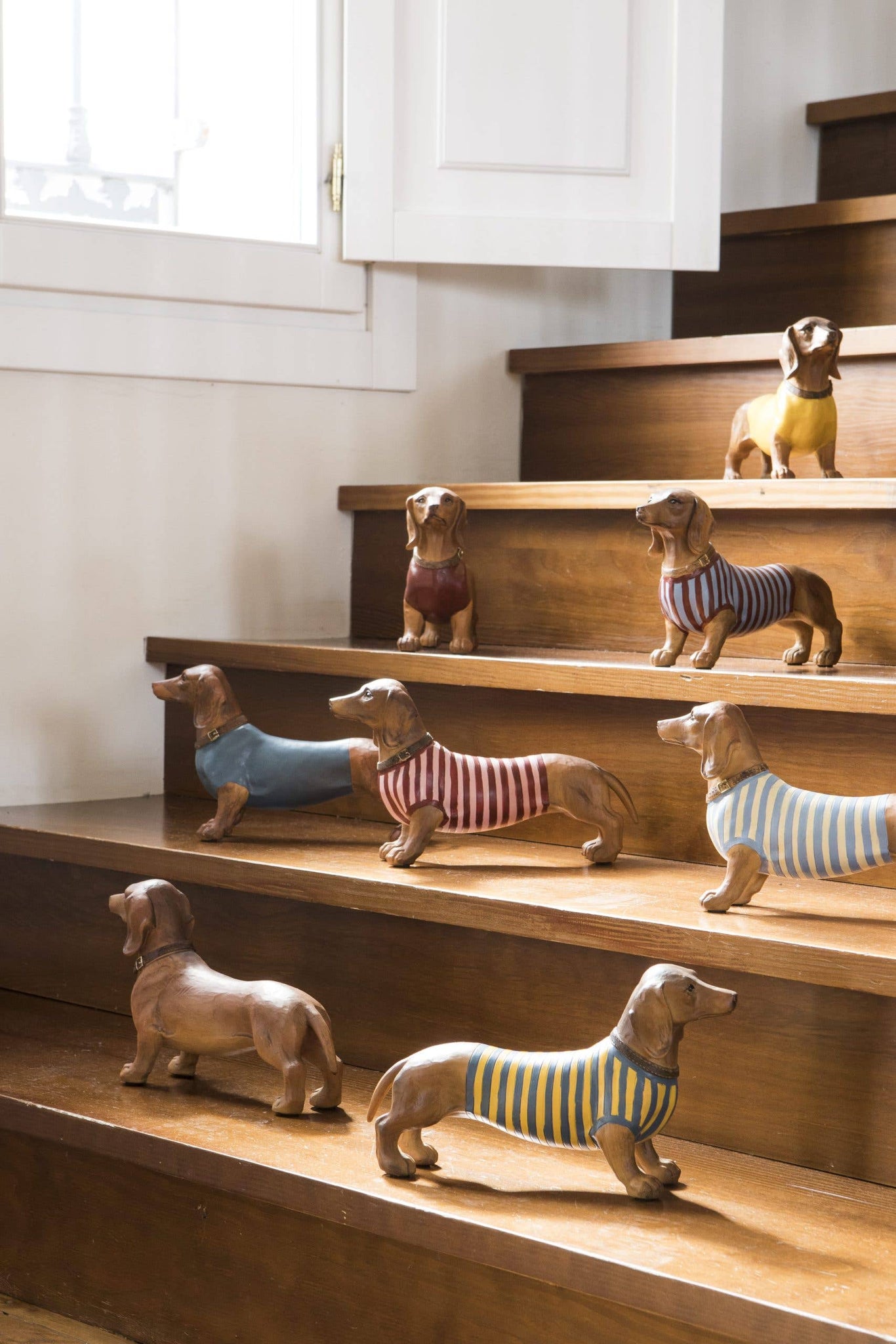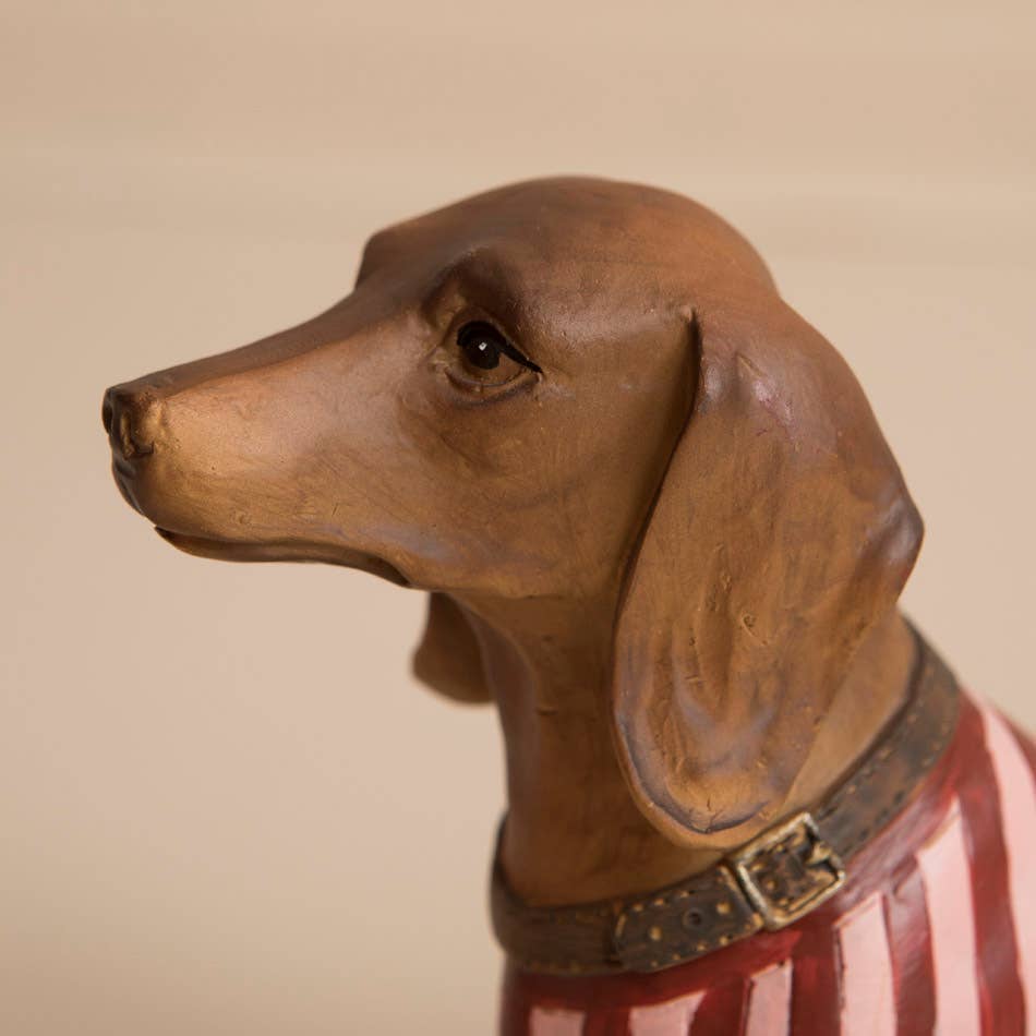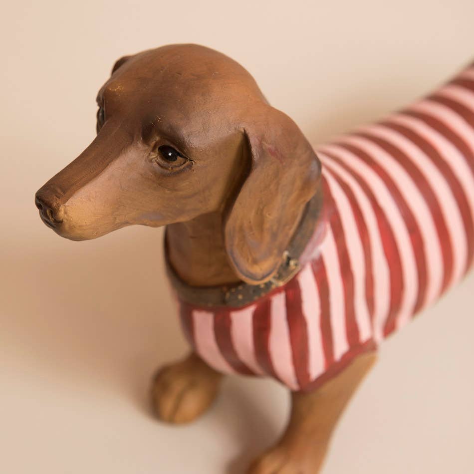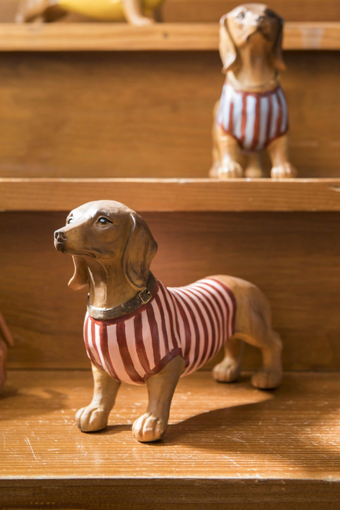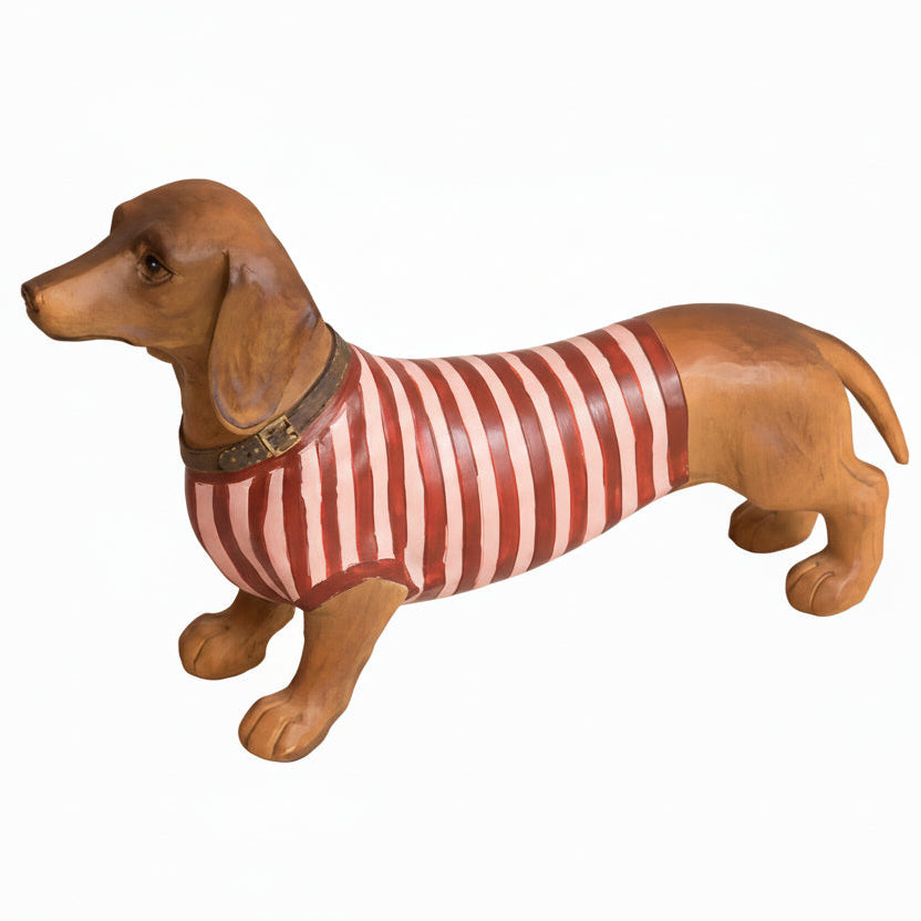 Añade un toque de personalidad y ternura a tu hogar con esta exclusiva figura de perro salchicha. Fabricada en resina de alta calidad, esta pieza destaca por su acabado detallado y su simpático diseño luciendo un jersey de rayas celestes y blancas con un collar clásico. Es el complemento perfecto para estanterías, recibidores o escritorios.