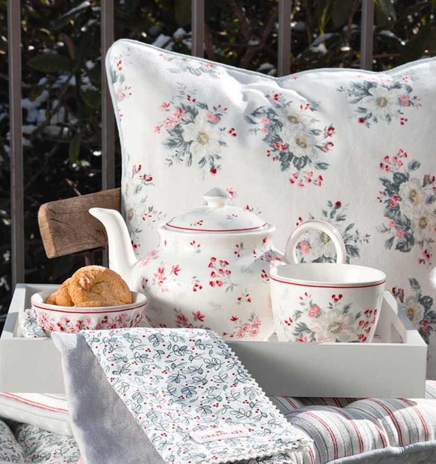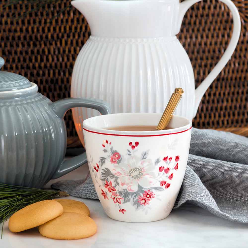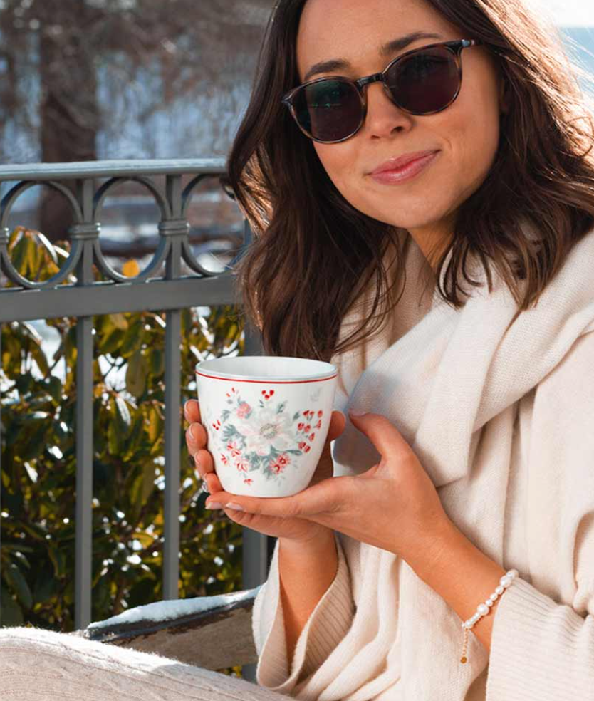 Aporta estilo nórdico y un toque floral a tus momentos de café con este vaso de café sin asa Abelone White, ideal para café con leche, té, zumos o postres.
