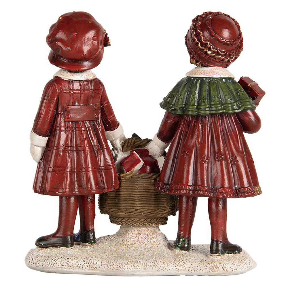 Figura navideña que representa a dos niñas vestidas con elegantes abrigos rojos y detalles dorados, sosteniendo una cesta llena de adornos y un paquete de regalo.