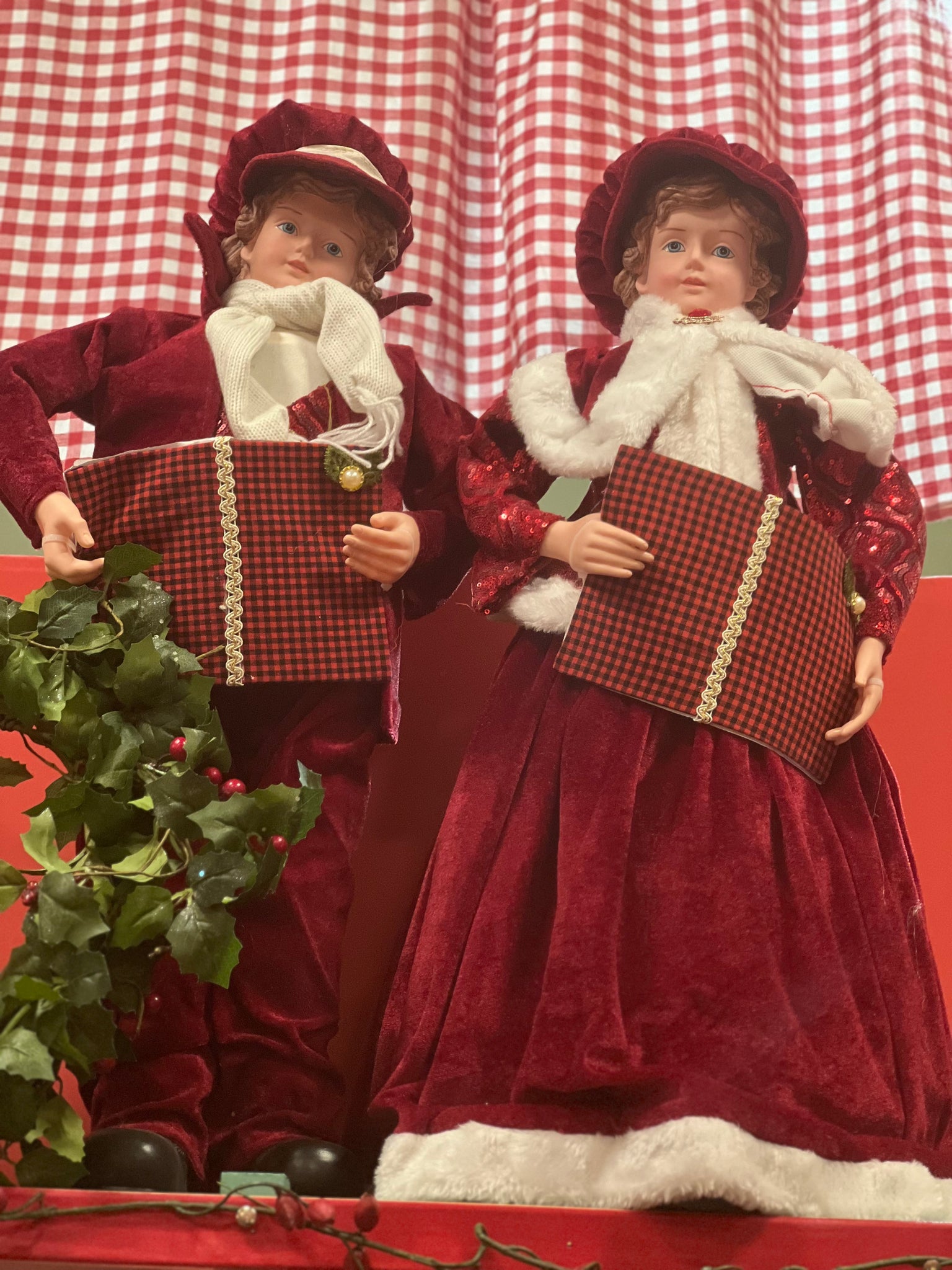 ¡Esta familia de villancicos está lista para cantar puerta a puerta esta Navidad! Cada miembro luce elegantes trajes de terciopelo burdeos y sostiene un cancionero negro lleno de partituras, aportando un toque clásico y sofisticado a tu decoración navideña.