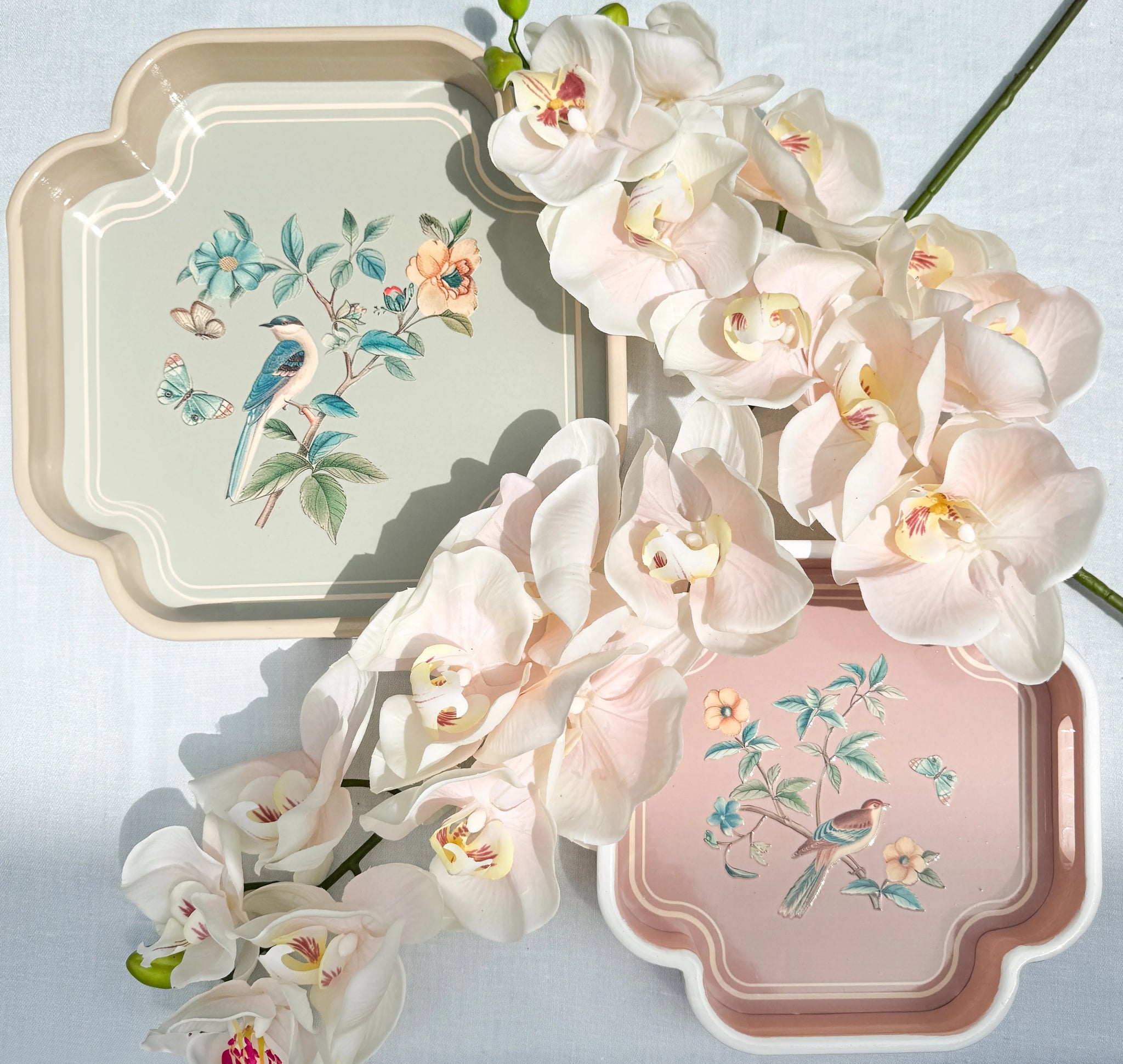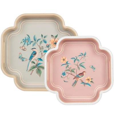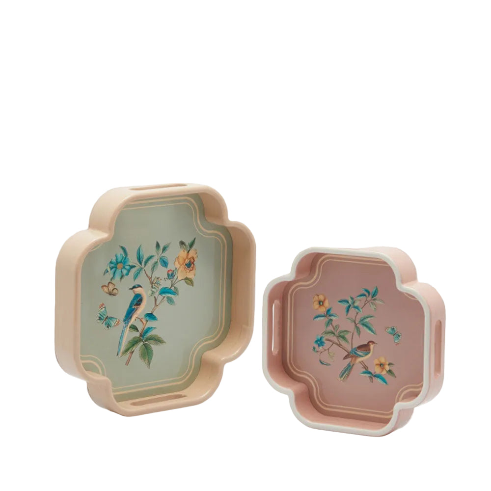 Delicadeza, alegría y amor por los detalles: dos bandejas de madera lacada aporta un toque de elegancia oriental a cualquier estancia gracias a su motivo de pájaros pintado a mano al estilo Chinoiserie.