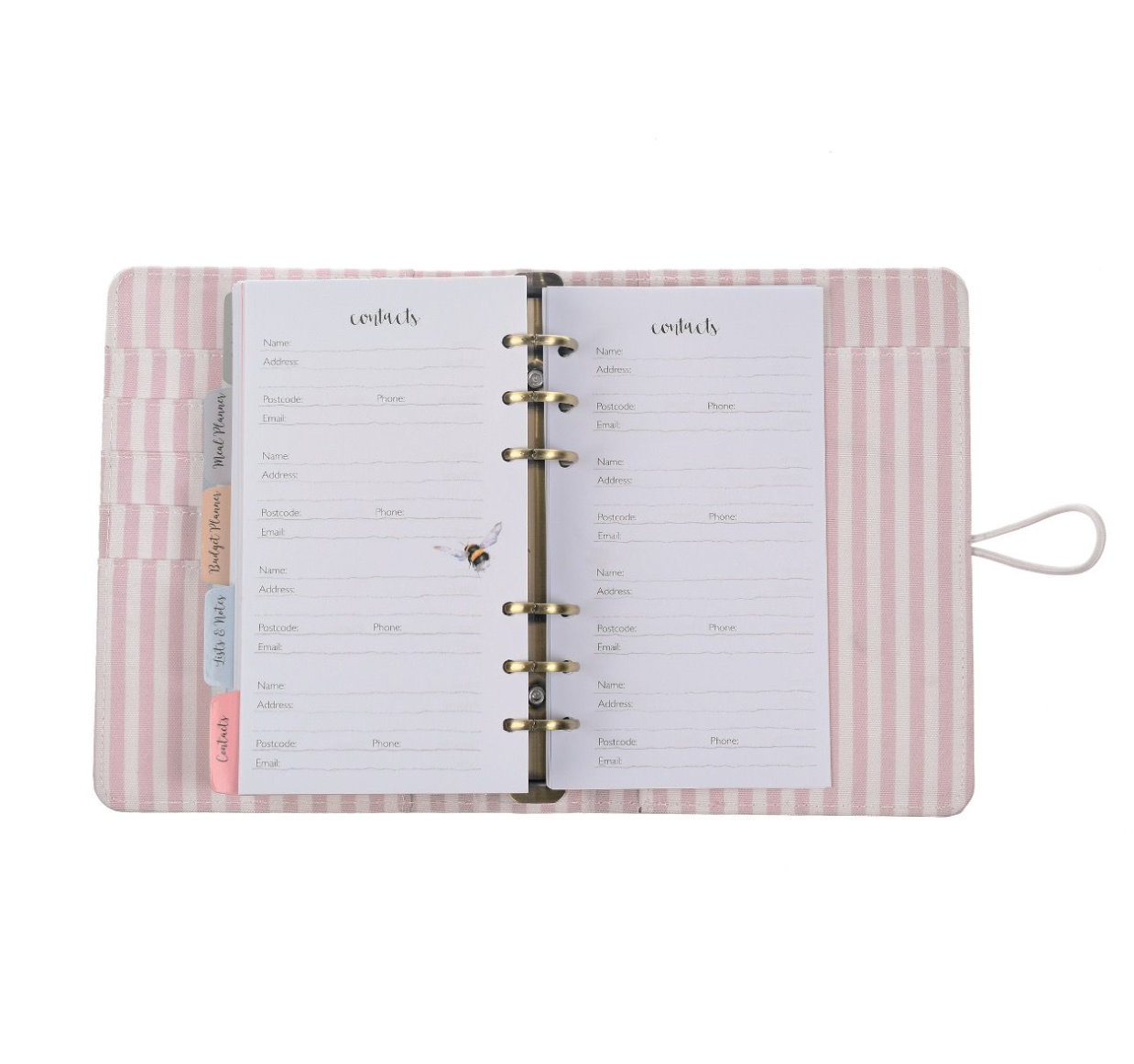 El organizador presenta una elegante superficie de cuero vegano texturizado, con un cierre elástico que se engancha en un distintivo perno con forma de pájaro (chochín). En su interior, las páginas se pueden organizar a tu gusto gracias a su sistema de anillas de hojas sueltas con un sofisticado acabado en latón cepillado.
