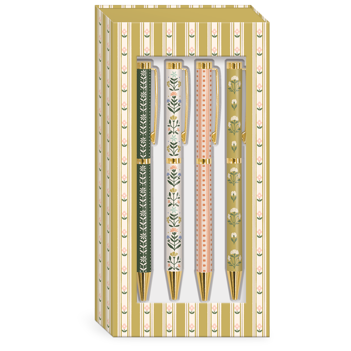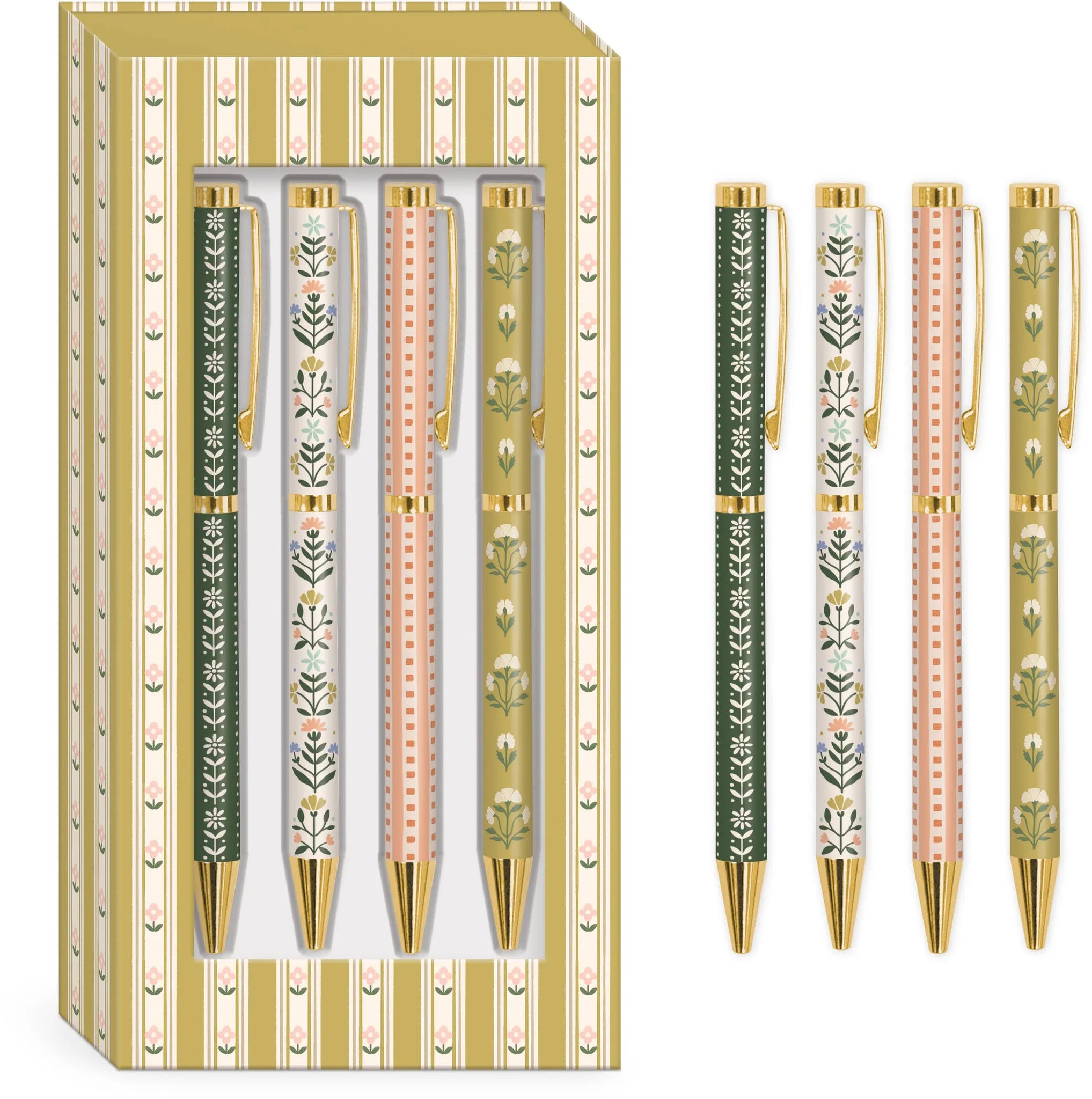 • Juego de 4 bolígrafos con motivos florales y detalles dorados.