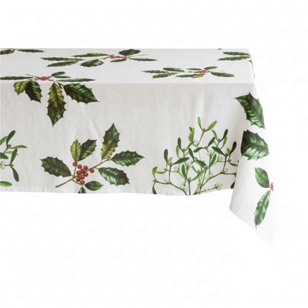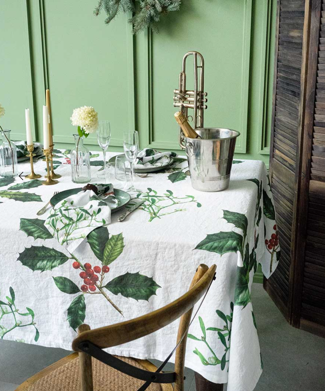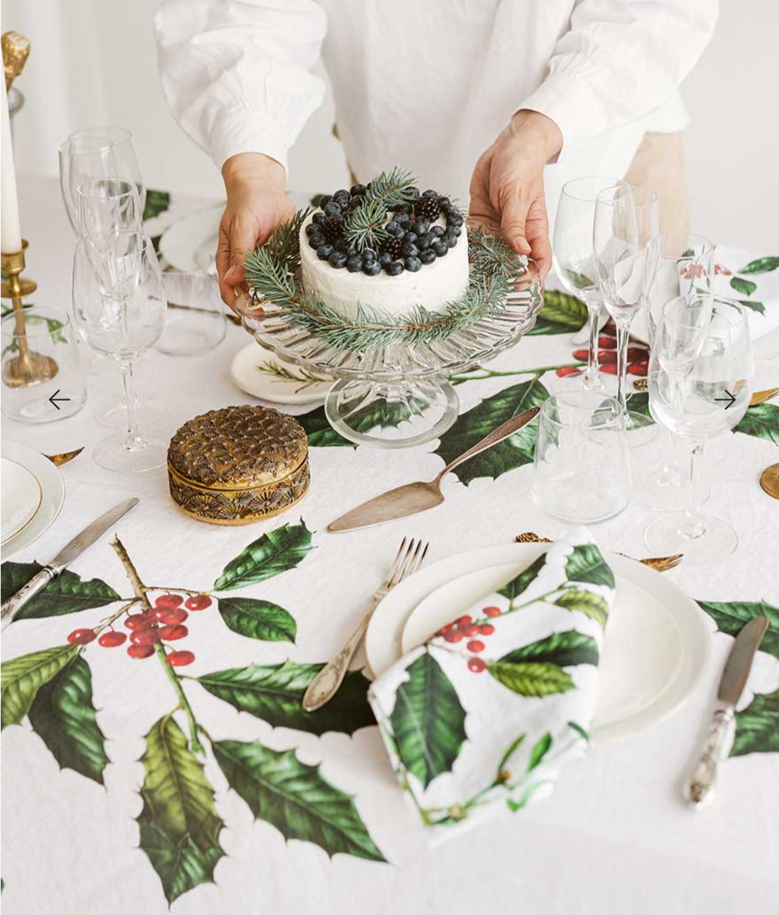 Celebra la temporada con nuestra encantadora mantelería de Acebo y Muérdago, confeccionada con el lino europeo lavado de la más fina calidad.