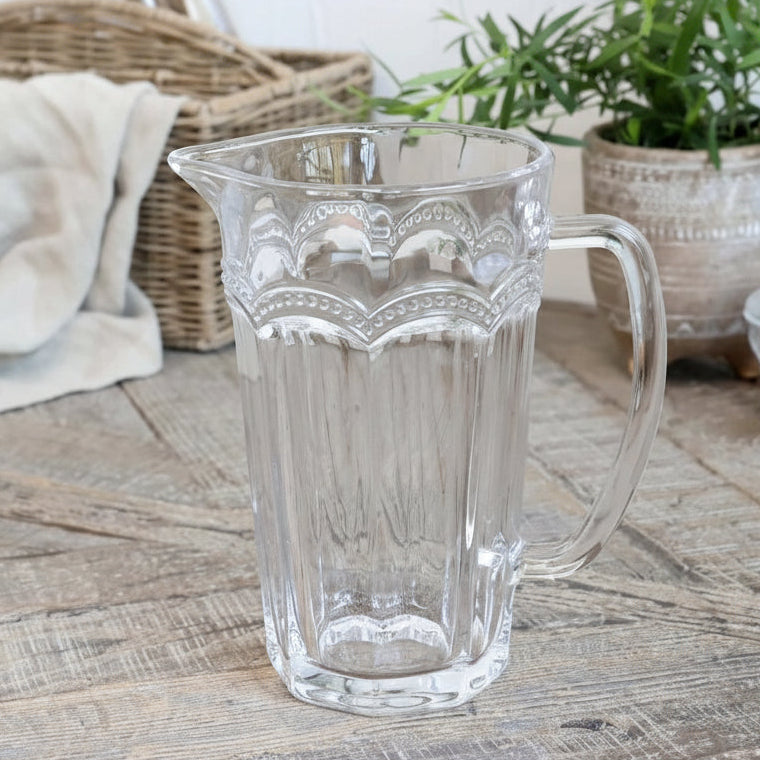 Añade un toque de distinción a tu mesa con la Jarra Antoinette de Chic Antique. Esta pieza no es solo un recipiente, es una declaración de estilo que captura la esencia del diseño romántico francés. Con su silueta redondeada y el icónico borde de perlas talladas en el cristal, esta jarra evoca la nostalgia de las meriendas en jardines provenzales.